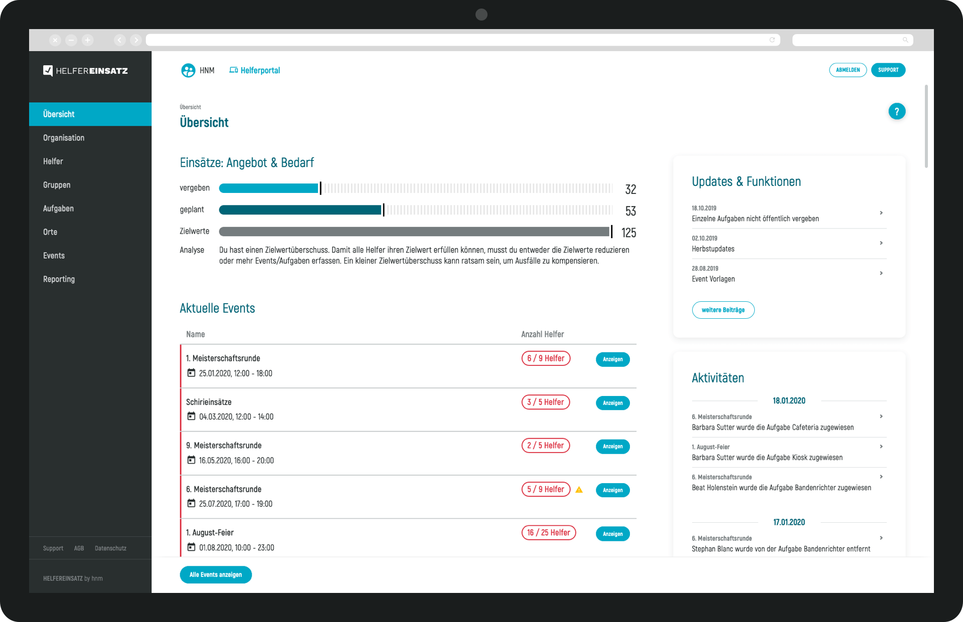Mit HELFEREINSATZ zeigst du deinen Helfenden, welche Aufgaben zur Verfügung stehen. Sie tragen sich selbständig ein und die Schichtverantwortlichen erhalten automatisch alle relevanten Informationen.