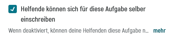 Dafür deaktiviert ihr unter "Aufgaben" in der Bearbeitung der betroffenen Aufgabe die Checkbox "Helfende können sich für diese Aufgabe selber einschreiben":
