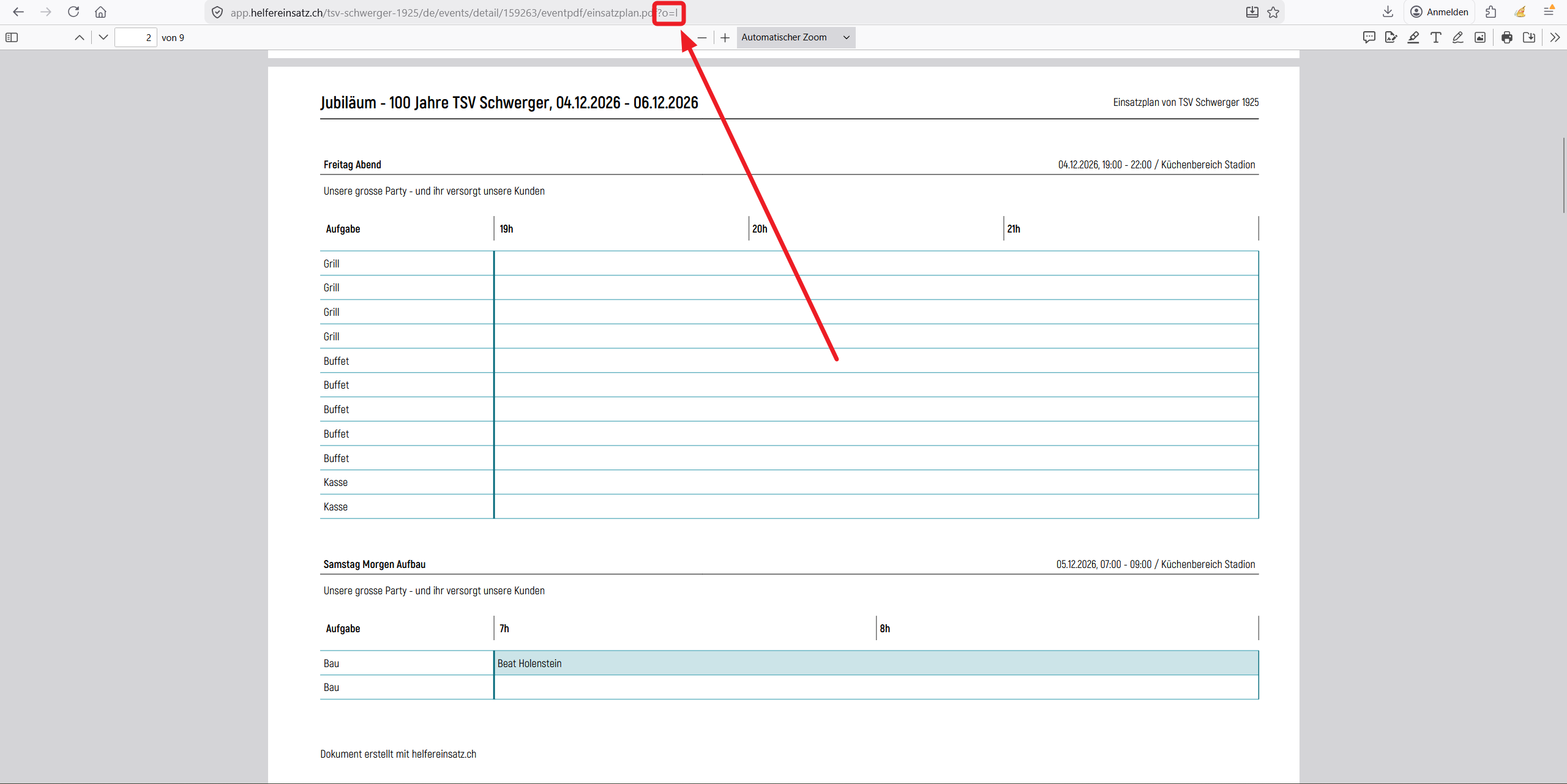 Einsatzplan ohne Helfendenliste (Helfendennamen werden im Plan angezeigt, die restlichen Daten auf der zweiten Seite werden aber nicht ausgegeben): ?d=0